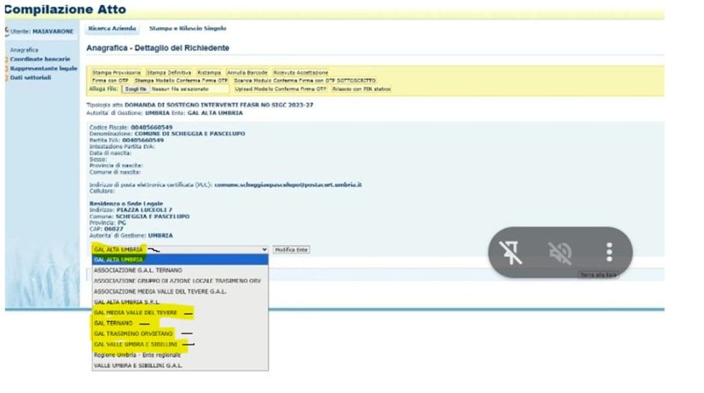 A seguito di problemi riscontrati da alcuni Comuni nella compilazione della Domanda di Sostegno per il bando promozione del GAL Alta Umbria, si segnalano gli "Enti GAL" che i tecnici devono impostare per la corretta attribuzione dell'ente. Nel menù a tendina infatti i tecnici troveranno sia gli enti GAL della programmazione 14/22 sia quelli della nuova programmazione che sono corretti (evidenziati nella figura in basso). Impostare un ente GAL non corretto, ad esempio ASSOCIAZIONE G.A.L. TERNANO (14/22) invece che GAL TERNANO (23/27) accenderà un'anomalia "ente assegnato non corretto" che non permetterà il rilascio della domanda e non potrà essere sanata. La domanda dovrà, in tal caso, essere cancellata e ricompilata.