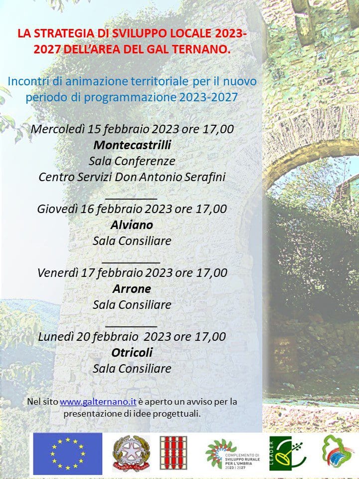 INCONTRI DI ANIMAZIONE TERRITORIALE SULLA PROPOSTA DI STRATEGIA DI SVILUPPO LOCALE PER L’AREA DEL GAL TERNANO – CSR 2023-2027
